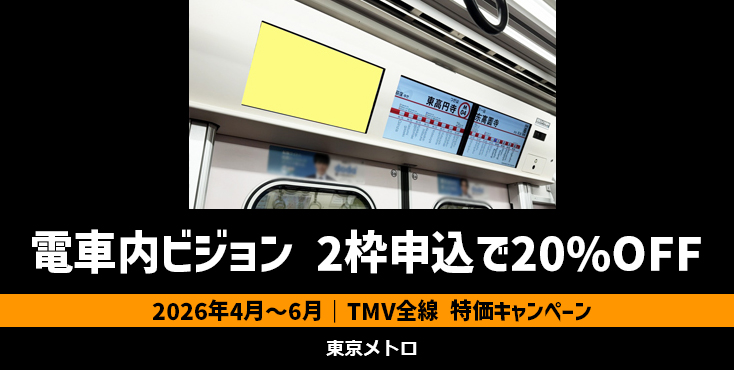 2026年4~6月掲載開始分に限り、TMV(車内デジタルサイネージ)を2枠ご購入で通常価格から20%オフでご出稿頂けるチャンスです!