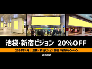 ※本記事は2026年3月に更新いたしました。 この記事では、西武鉄道にて実施できるお得な広告キャンペーン情報をご案内いたします。 2026年4月掲載開始分に限り、西武新宿駅・西武池袋駅のデジタルサイネージ広告をお得にご出 … 続きを読む 【4月限定】西武 池袋駅・新宿駅 デジタルサイネージ 春季キャンペーン