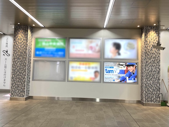 東口へと至る箇所に設置された、6つの枠が並ぶ駅看板のひとつです。電飾看板であるため自然と発光して見え、意識せずとも視界に入りやすい構造となります。また周囲の明るさに捉われず掲載ができるためしっかりと目立つのも特徴です。改札付近にあるため乗車時・降車時いずれにも視界に入りやすく、繰り返しによる広告効果が得られやすいと言えます。